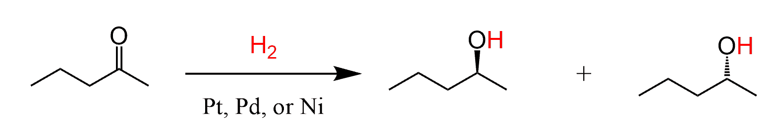 The reduction of unsymmetrical ketones with LiAlH4 or NaBH4 produces a pair of stereoisomers because the hydride ion can attack either face of the planar carbonyl group:
