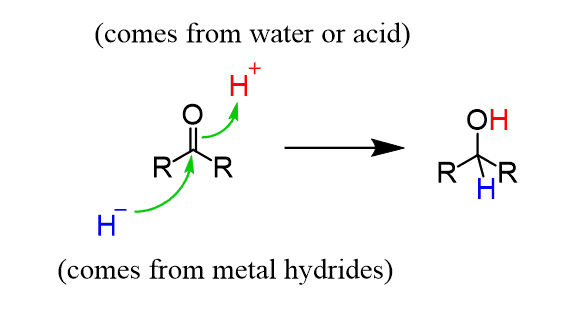 As mentioned earlier, both reagents function as a source of hydride (H−), which acts as a nucleophile attacking the carbon of the carbonyl C=O bond, and in the second step, the resulting alkoxide ion is protonated to form an alcohol.