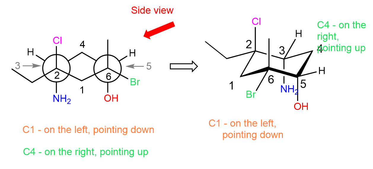 Next, we look from the side to determine the chair form of the ring. For example, looking from the right, we are going to have carbon 1 on the left, and carbon 4 on the right side of the chair. All the groups that are pointing up, must also point up, and those pointing down, must also point down in the chair conformation: