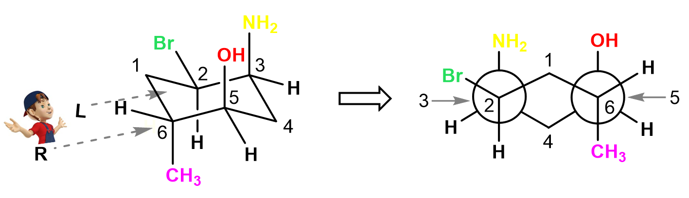 Let’s again number starting from the left carbon going clockwise. The first Newman projection is for the view from the top left corner: