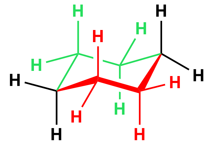 There are two bonds we are looking through, so you can visualize this as two Newman projections which are connected via the foremost left and right carbons of the ring. To illustrate this, let’s color in red the part of the ring that is closer to us, and the other half that is away from us, in green: