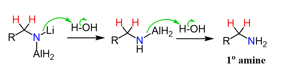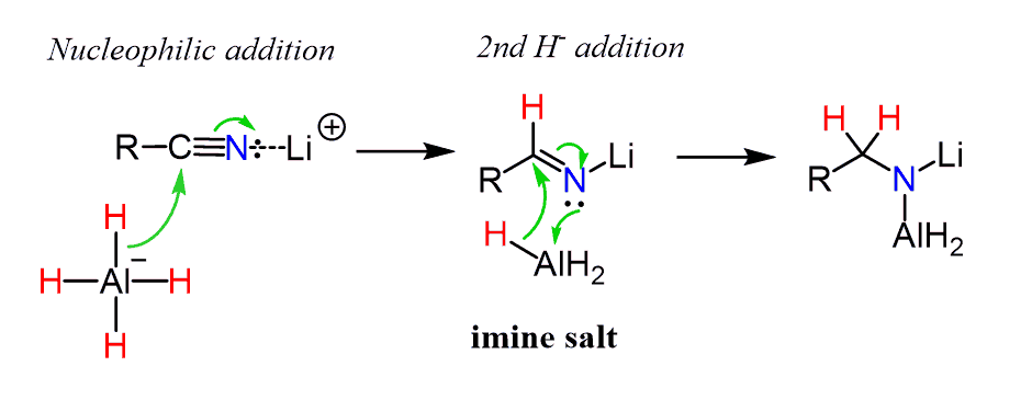 The reaction starts with q nucleophilic addition of a hydride ion. This forms an imine salt, which undergoes another nucleophilic addition by AlH3, producing a highly reactive derivative of an amine: