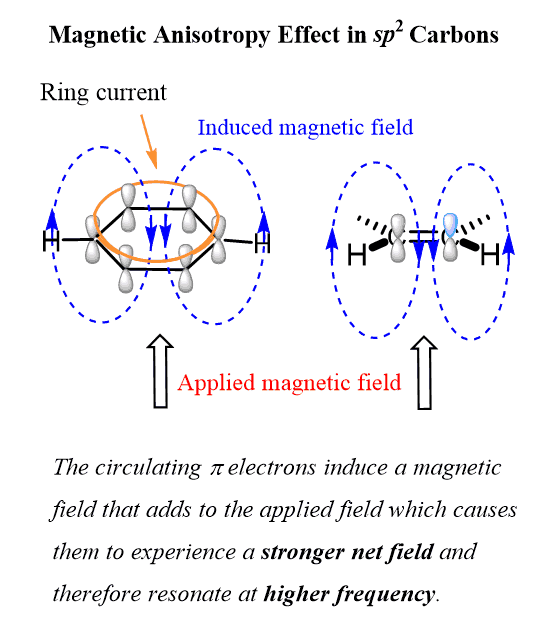 The second reason is a phenomenon called magnetic anisotropy. When protons on carbon-carbon double bond are placed in a magnetic field, the circulating π electrons create a local magnetic field that adds to the applied field which causes them to experience a stronger net field and therefore resonate at a higher frequency:
