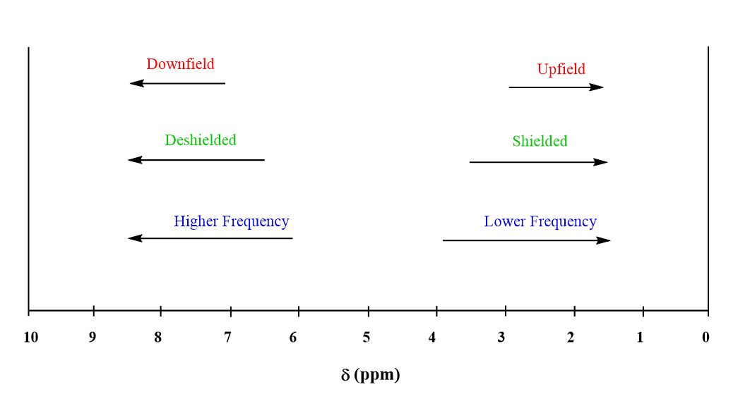 Downfield means higher energy – left side of the spectrum (higher ppm)