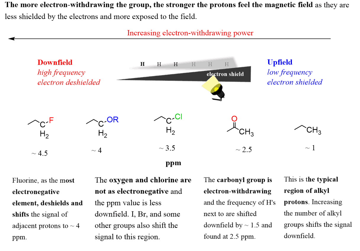 The image below can visualize the effect of electron-withdrawing groups on the chemical shift. Suppose the light is the magnetic field, and the triangular object is the electron cloud/density around the given nucleus. The larger the object (the electron cloud) in front of the nucleus, the less it is exposed to the light (magnetic field), thus the smaller the chemical shift. On the contrary, towards the left, we have nuclei that are surrounded by a smaller electron density, and thus the stronger field exposure causes their signal to appear in a higher energy region (downfield):
