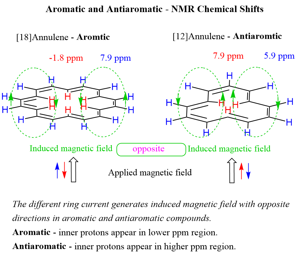 Interestingly, antiaromatic compounds generate a different ring current which in turn generates an induced magnetic field with opposite directions than in aromatic compounds. Thus, antiaromatic systems show the opposite trend: the inner protons appear in a higher ppm area than the outer protons. For example, the protons outside the ring of [12]annulene appear at 5.91 ppm whereas the inner protons are characterized by a chemical shift of 7.86 ppm: