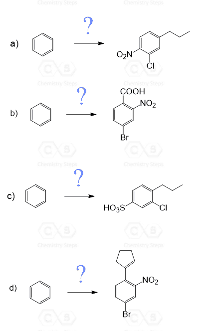 The order of reactions is very important! So, before every step, consider the ortho– , para– , or meta directing effect of the current group on the aromatic ring.