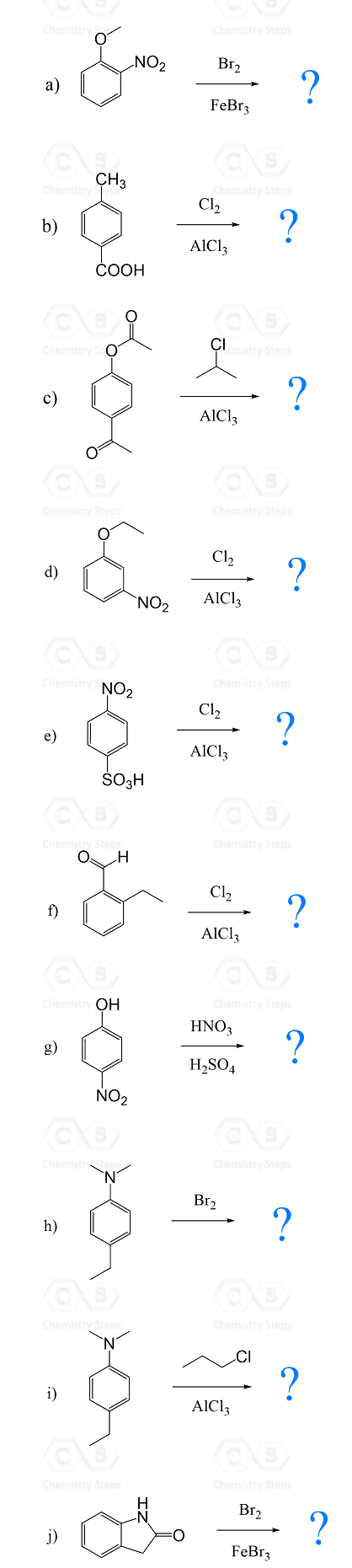 1. In problem 1, part d) I got that one substituent is a strong activator while the other is a strong deactivator, why does the activator take precedence over the deactivator? Wouldn’t placing the Cl on the meta position (relative to the nitrogen group) give less steric hindrance? Any explanation would be appreciated!!