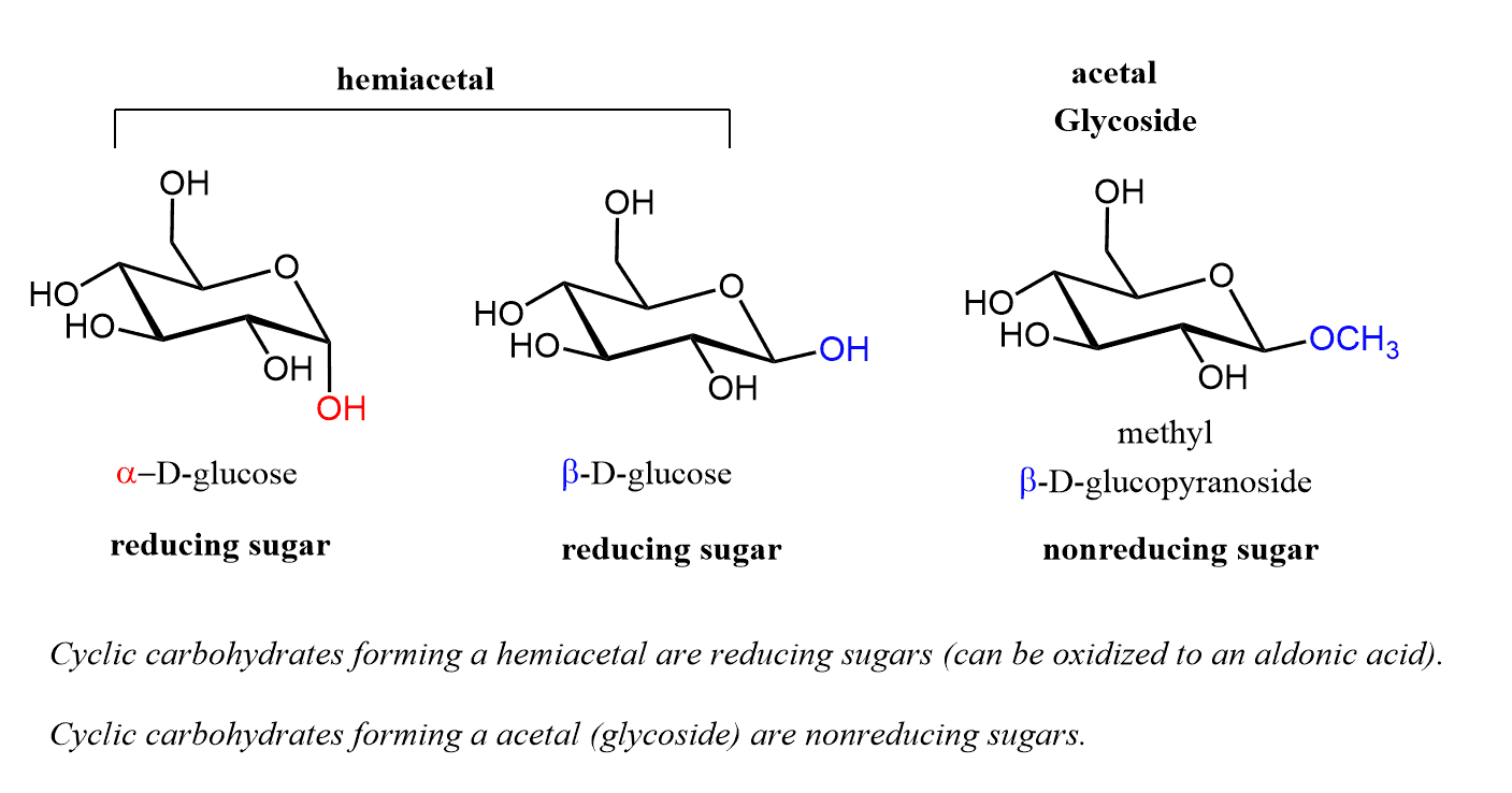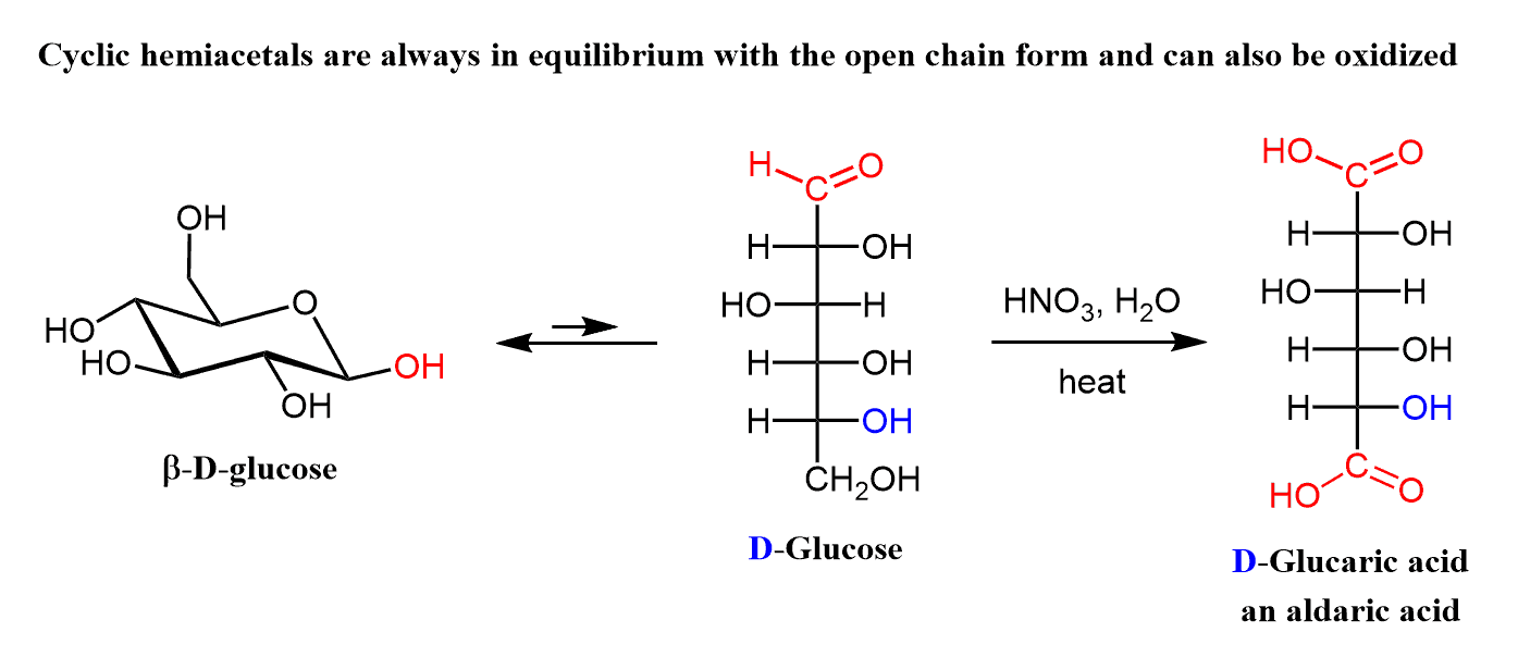 Remember also that cyclic hemiacetals are always in equilibrium with the open-chain form and therefore, they can also be oxidized to aldonic or aldaric acids – they are reducing sugars:
