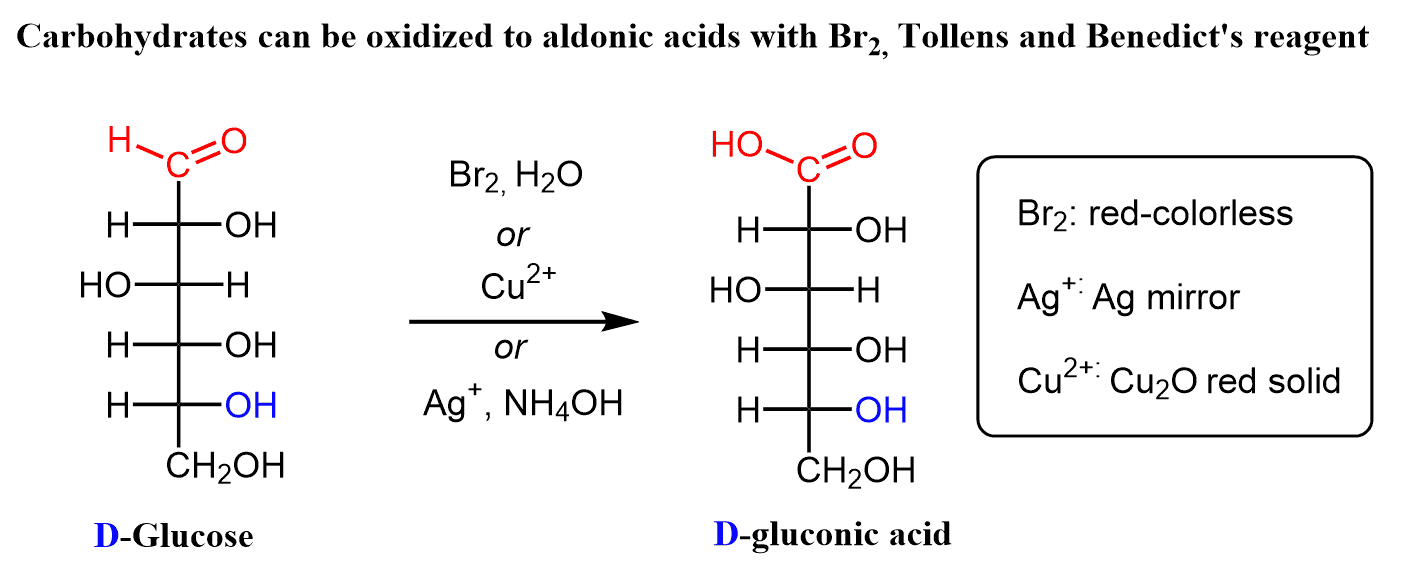 Now, in all the reactions above, the carbohydrates were oxidized and therefore, the oxidizing agents were reduced. So, the oxidizing agents are reduced by the carbohydrates, and because of this, any carbohydrate that gives a positive test with Tollens, Benedict’s, or Fehling’s reagent is called a reducing sugar. Consequently, carbohydrates that do not react with these oxidizing reagents are classified as nonreducing sugars.