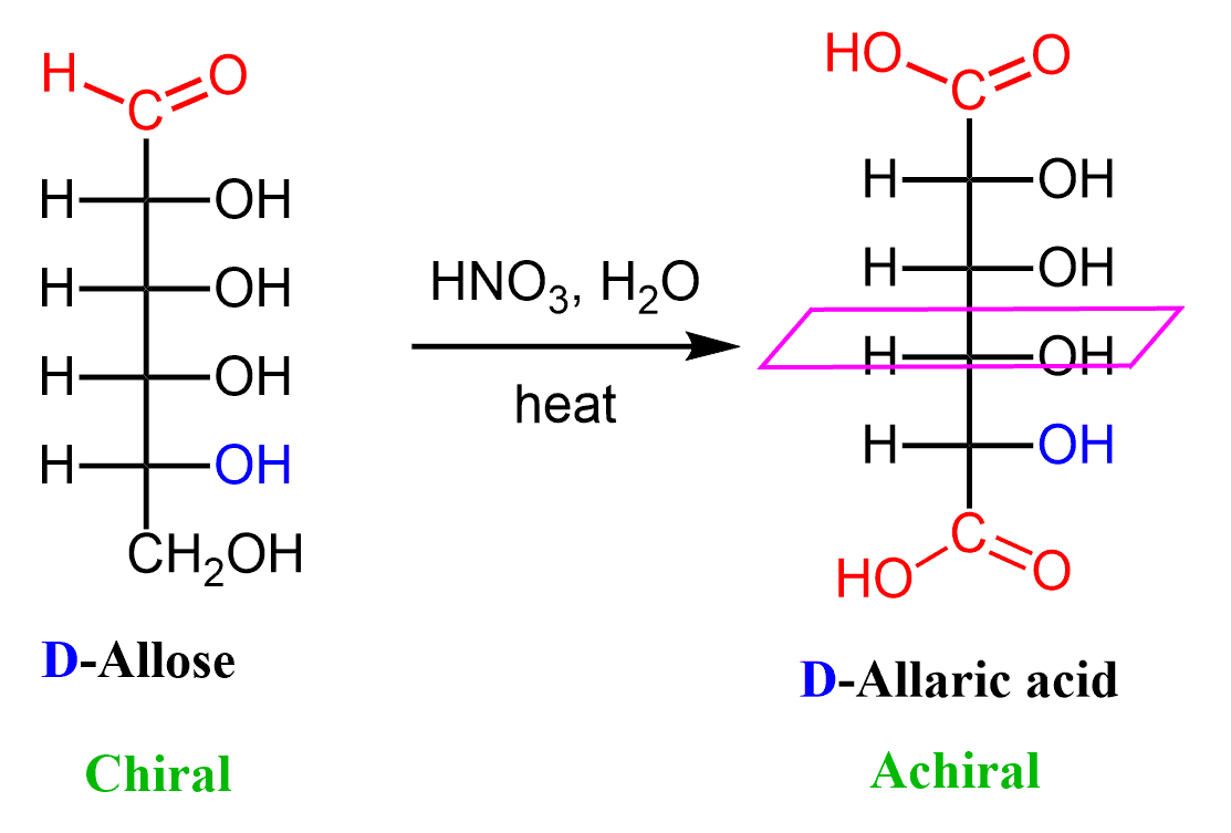 One feature of aldaric acids is that they have two identical groups (COOH) on the terminal carbons, and therefore, it is always a good idea to check whether it is a meso compound. For example, D-Glucose is chiral while D-glucaric acid is a meso compound, as can be seen from the perpendicular plane of symmetry on the Fischer projection. Remember, meso compounds are not optically active and therefore are achiral.