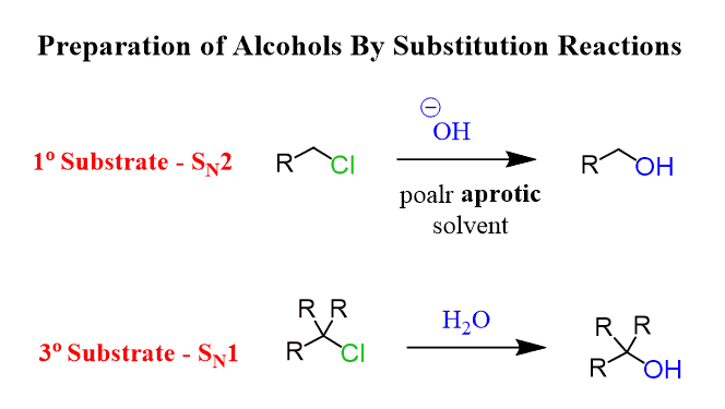 Alcohols can be prepared by substitution reactions using hydroxides and substrates with good leaving groups, such as alkyl halides.