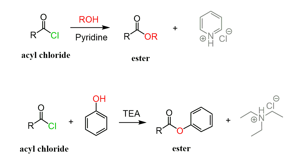 Acid chlorides can easily be converted into esters by reacting with alcohols. A base such as pyridine or triethylamine (TEA) is usually added to speed up the process by deprotonating the positively charged intermediate: