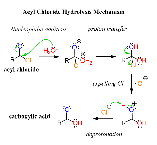 The reaction involves a nucleophilic addition of water, followed by a proton transfer, forming a geminal diol. Geminal diols are not stable, and one of the oxygens kicks out the Cl to eventually produce a carboxylic acid: