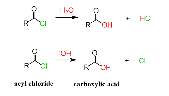 Let’s first mention that acid chlorides need to be kept in dry conditions since they react readily with water, forming carboxylic acids. The reaction is even faster with hydroxides since those are stronger nucleophiles: