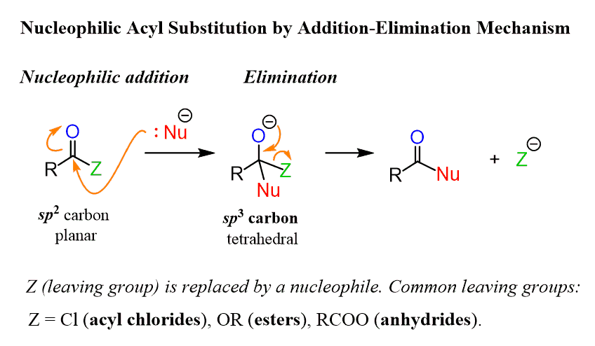 A quick reminder, in a nucleophilic acyl substitution, the leaving group is replaced by a nucleophile by the addition-elimination mechanism: