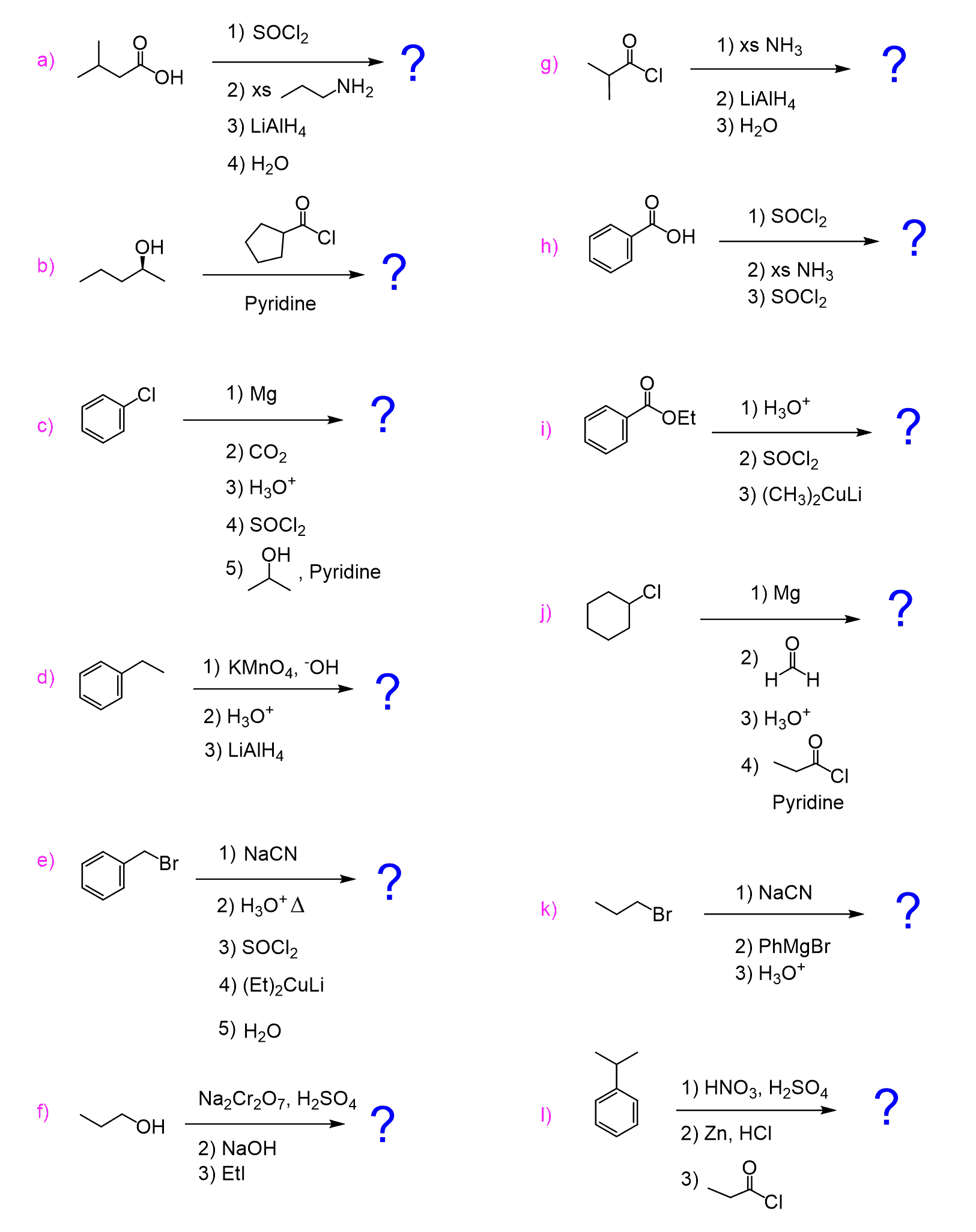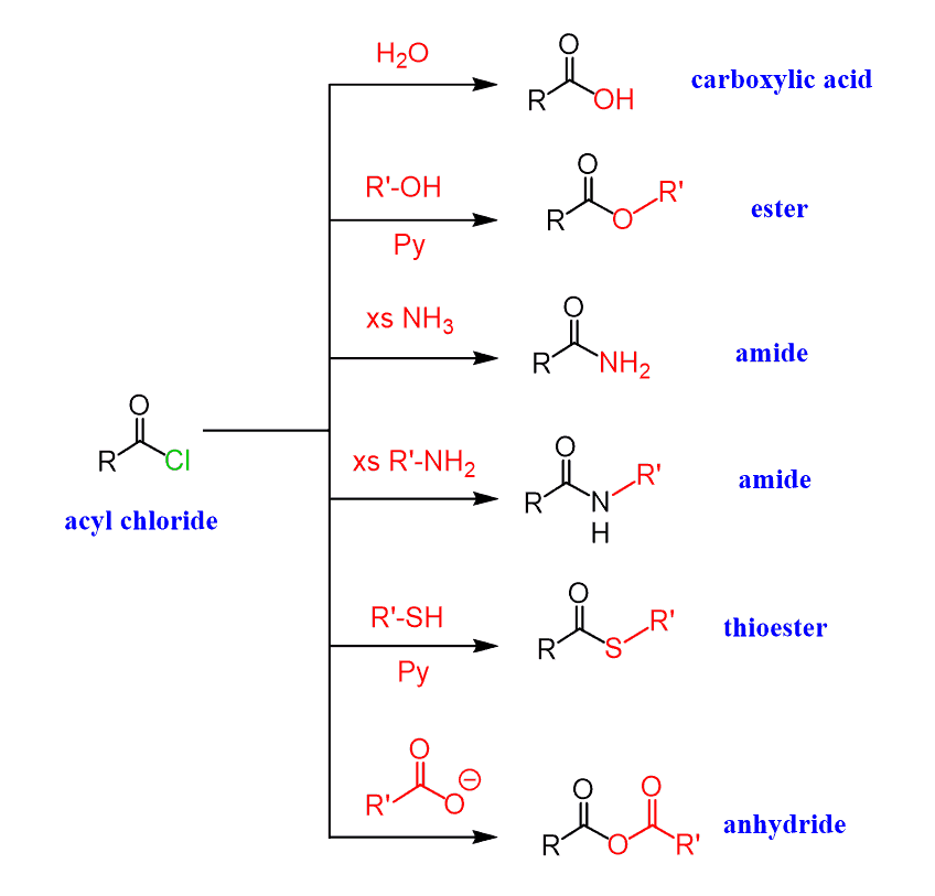 Let’s summarize what we have learned about acyl chlorides so far. Keep in mind that they are the most reactive carboxylic acid derivatives and therefore can be used to ease the path of converting a carboxylic acid into an ester, amide, or anhydride. All of these can be achieved in mild conditions, while the direct conversion from carboxylic acids requires more forcing conditions: