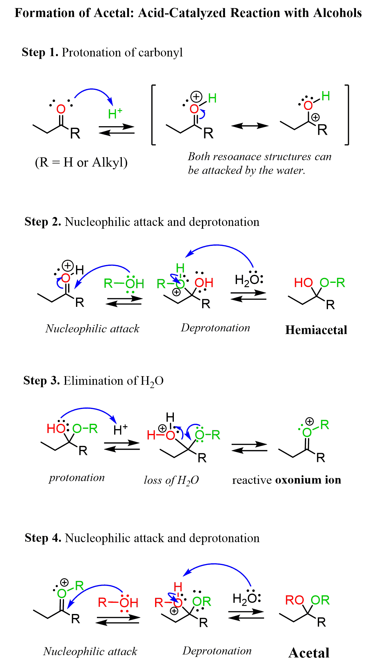 Let’s put this mechanism of acid-catalyzed formation of acetals in a nice summary: