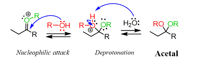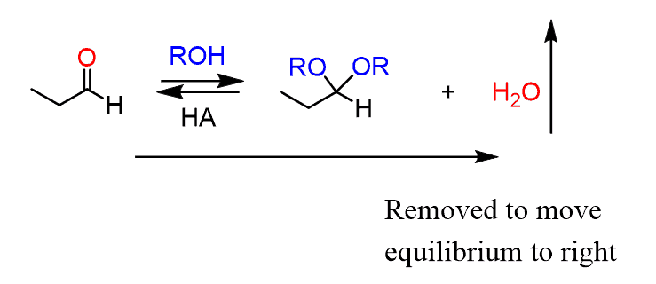 The synthesis of acetals, on the other hand, produces water as a by-product. This is a great advantage since the equilibrium can be shifted to the right by removing the water as it is formed and forcing the completion of the reaction: