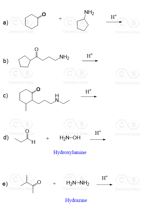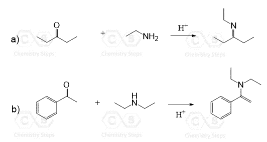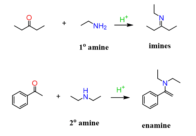 In the previous two posts, we have seen that aldehydes and ketones react with primary amines, in mildly acidic conditions, forming an imine (a Schiff base). The reaction with secondary amines produces enamines: