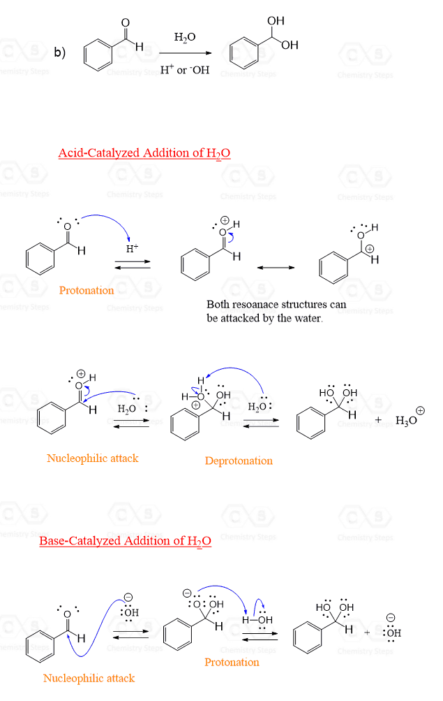 Before discussing the acid and base-catalyzed hydration of aldehydes and ketones, it is worth mentioning that the water itself reacts slowly with the carbonyl group, and the acid and base are only used to speed up the process.
