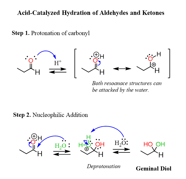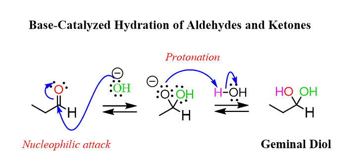 So, in the first step, the –OH attacks the carbonyl carbon, cleaving the π bond, and moving an electron pair onto oxygen. This forms a negatively charged intermediate which, upon protonation by water, results in a geminal diol: