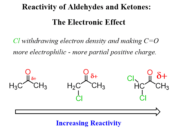 Consequently, electron-withdrawing groups near the carbonyl carbon decrease its electron density, thus making it more reactive in nucleophilic addition reactions.