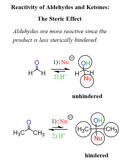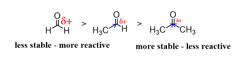 The partial positive charge of the carbon is suppressed by attached alkyl groups (remember, alkyl groups are electron donors), and therefore, aldehydes are more reactive than ketones: