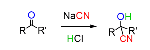 These are nucleophilic substitution reactions and we introduce the nitrile group by using the nucleophilicity of the cyanide ion. In a similar manner, aldehydes and ketones can be converted to cyanohydrin: