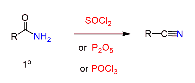Another method of preparing nitriles is their dehydration by SOCl2, P2O5, and POCl3: