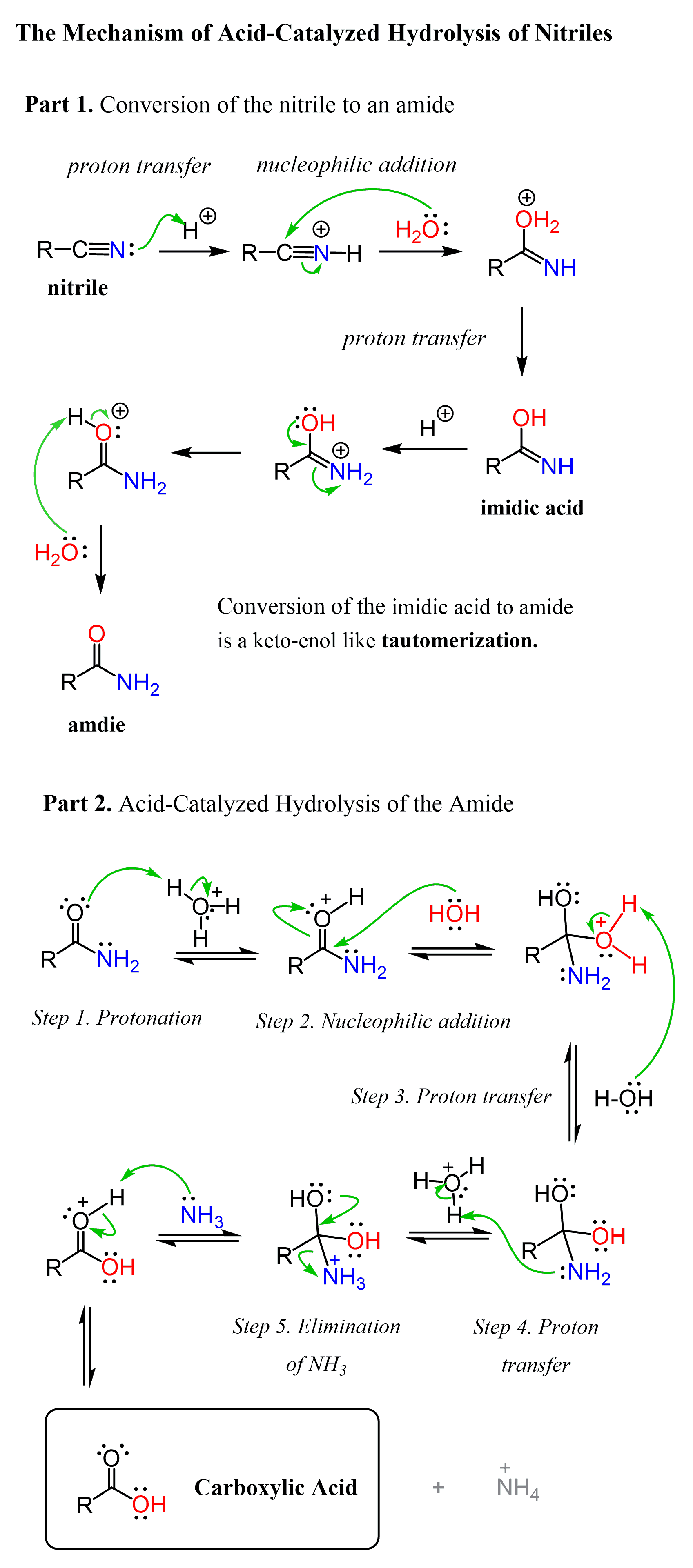 The acid-catalyzed hydrolysis of nitriles starts with the protonation of the nitrogen which activates the triple bond and allows for a nucleophilic addition of water. This forms an intermediate imidic acid which tautomerizes to the corresponding amide: