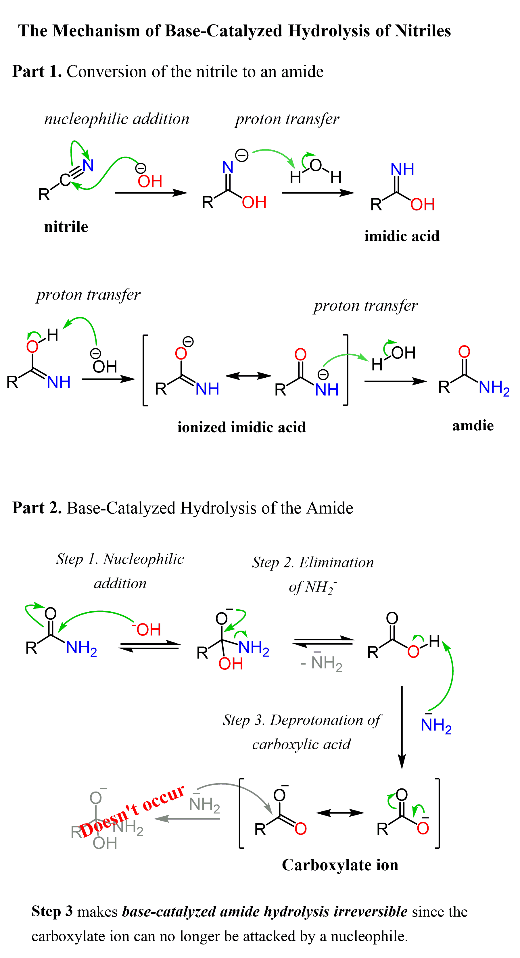 The base-catalyzed nitrile hydrolysis starts with a nucleophilic addition of the hydroxide ion to the C-N triple bond forming an intermediate with a negative charge on the nitrogen which quickly removes a proton transforming into an imidic acid which again tautomerizes to the intermediate amide. In the second part of the reaction, the amide is hydrolyzed to the corresponding carboxylic acid: