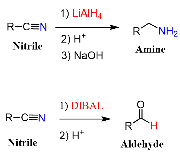Nitriles can be reduced to primary amines when treated with LiAlH4 or to aldehydes when a milder reducing agent such as DIBAL is used.