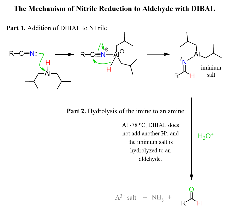 The reaction, again, starts with a hydride addition to the C-N triple bond forming an iminium anion. DIBAL is a bulky reducing agent and unlike LiAlH4 the second hydride addition does not occur due to steric hindrance and the iminium salt intermediate is hydrolyzed to the corresponding aldehyde: