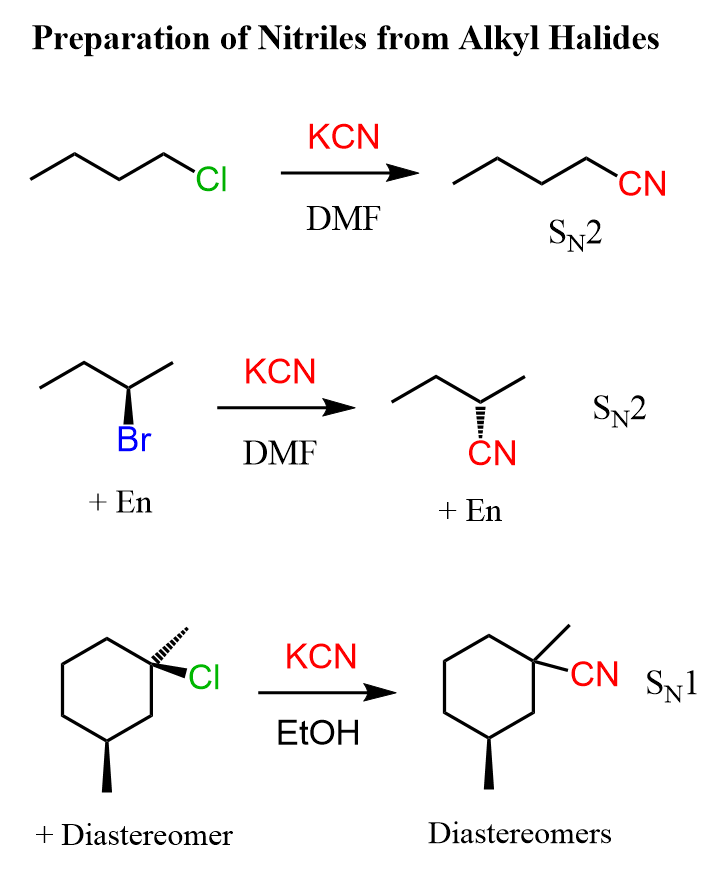 Nitriles can be prepared by substitution reactions of alkyl halides with cyanide salts: