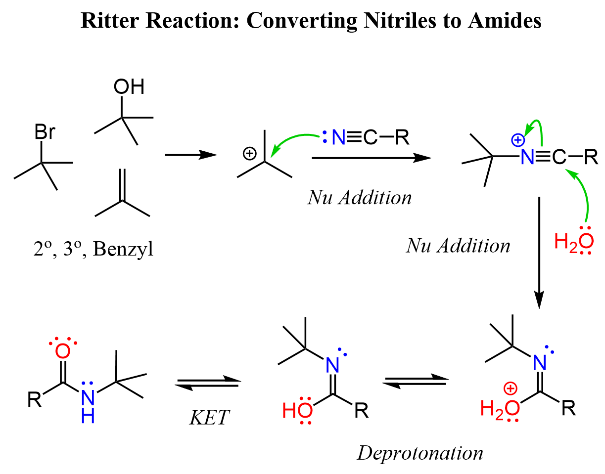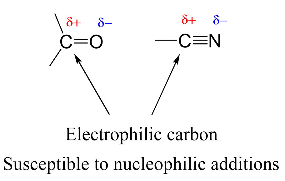 The polarized π bond allows for different nucleophilic additions such as hydride, water, organometallics, etc. So, let’s discuss here the most common reactions of nitriles that go via a nucleophilic addition to the C-N triple bond.