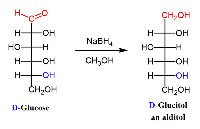 The carbonyl group in aldoses and ketoses can be reduced by NaBH4 to a 1o and 2o alcohol respectively. The product of this reaction is a polyalcohol called an alditol.