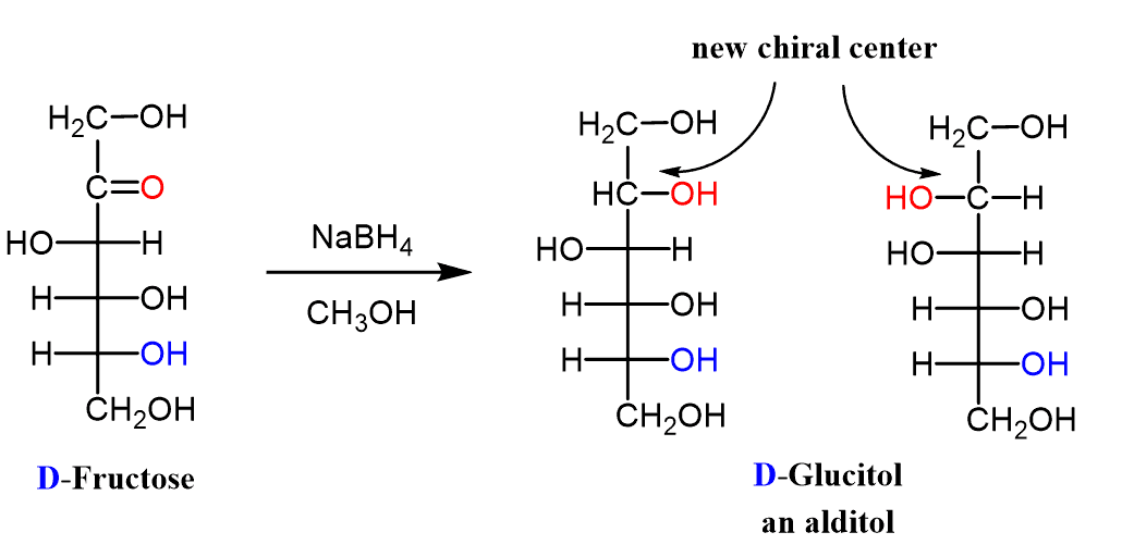The reduction of the ketoses creates a new chiral center in both configurations. This is because the carbonyl group is transformed into a secondary alcohol while in the case of aldoses, it forms a primary alcohol which is not chiral.