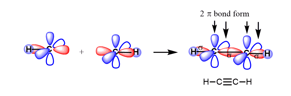 Let’s see how this happens in acetylene – C2H2. The two carbon atoms make a sigma bond by overlapping the sp orbitals.