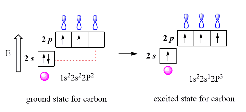 Pay attention that the electron goes uphill as the p subshell is higher in energy than the s subshell, and this is not energetically favorable, but we will see how it is compensated in the next step when orbitals are mixed (hybridized).