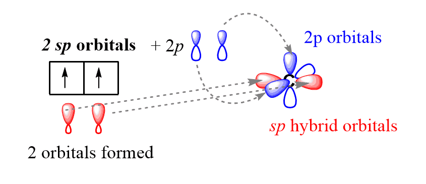 In sp hybridization, the s orbital of the excited state carbon is mixed with only one out of the three 2p orbitals. It is called sp hybridization because two orbitals (one s and one p) are mixed: