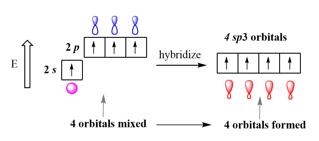 So, in the next step, the s and p orbitals of the excited state carbon are hybridized to form four identical in size, shape, and energy orbitals.
