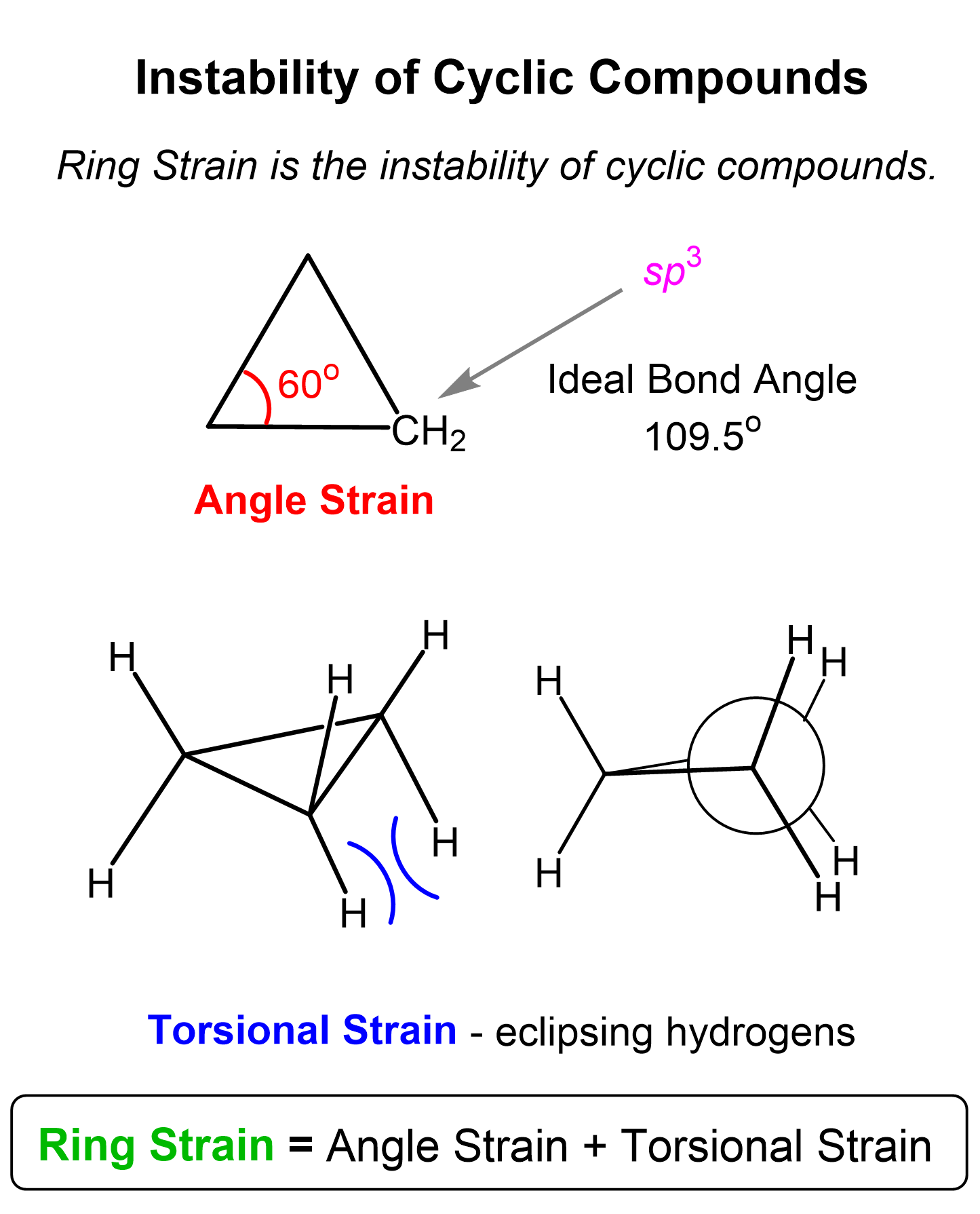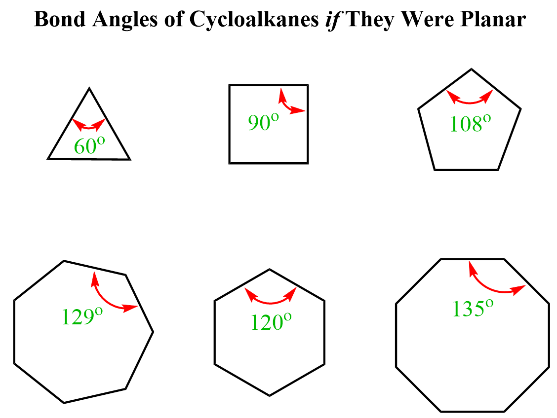 And that is essentially the answer to why cycloalkanes are less stable than open-chain alkanes. It is even more evident if we recall that in alkanes and cycloalkanes the carbons are sp3-hybridized, which means their ideal bond angle is 109.5o. A glimpse of memories from geometry class should remind us that the angles in a triangle are 60o, and 90o in a square: