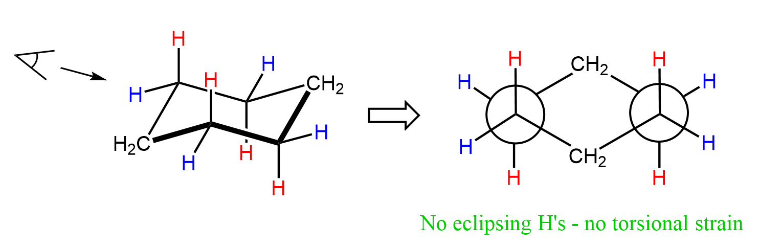 In this geometry, the carbon atoms are positioned so that the bond angles are very close to the ideal tetrahedral angle of 109.5° (sometimes reported as 111.4°), and all the C−H bonds are staggered, which eliminates any eclipsing interactions. We can see this in Newman projections of the chair conformation: