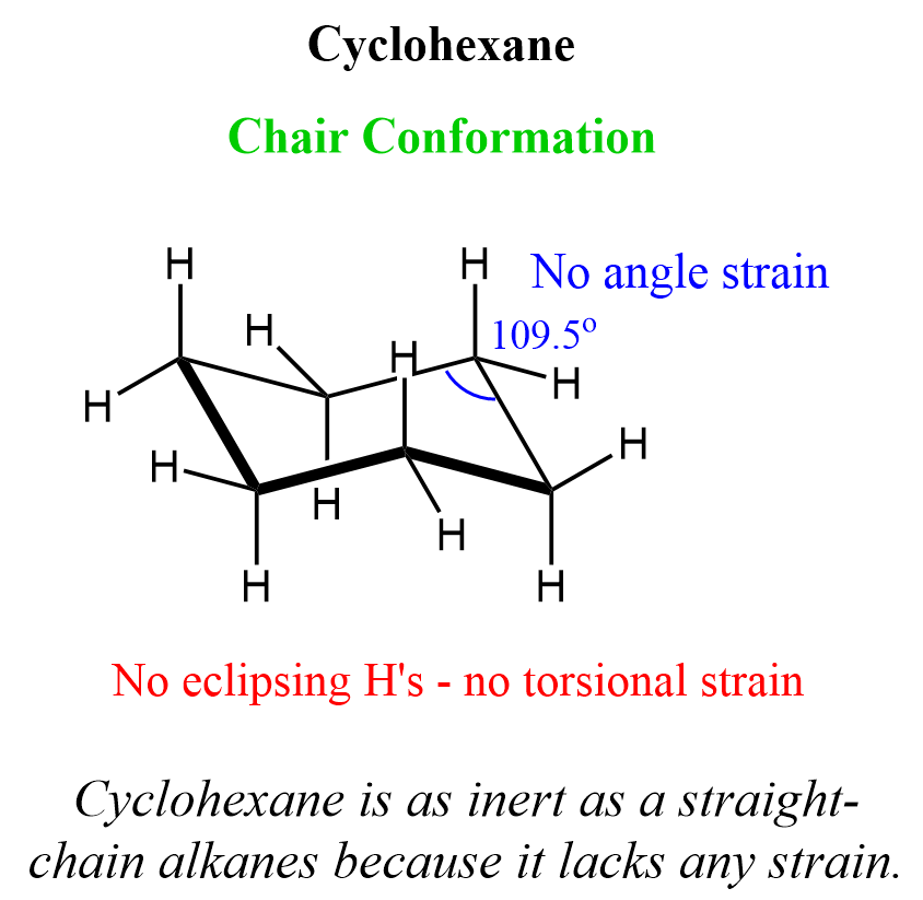 Cyclohexane is the most common ring structure found in both natural and synthetic compounds, and the reason for this is its exceptional stability. Unlike smaller cycloalkanes we have seen so far, it avoids both angle strain and torsional strain by adopting the most stable conformation known as the chair conformation.