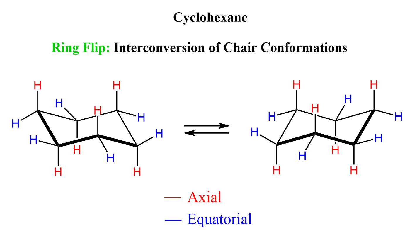 The process of interchanging between two chair conformations is called ring-flip, which happens via rotation about the C-C single bonds: