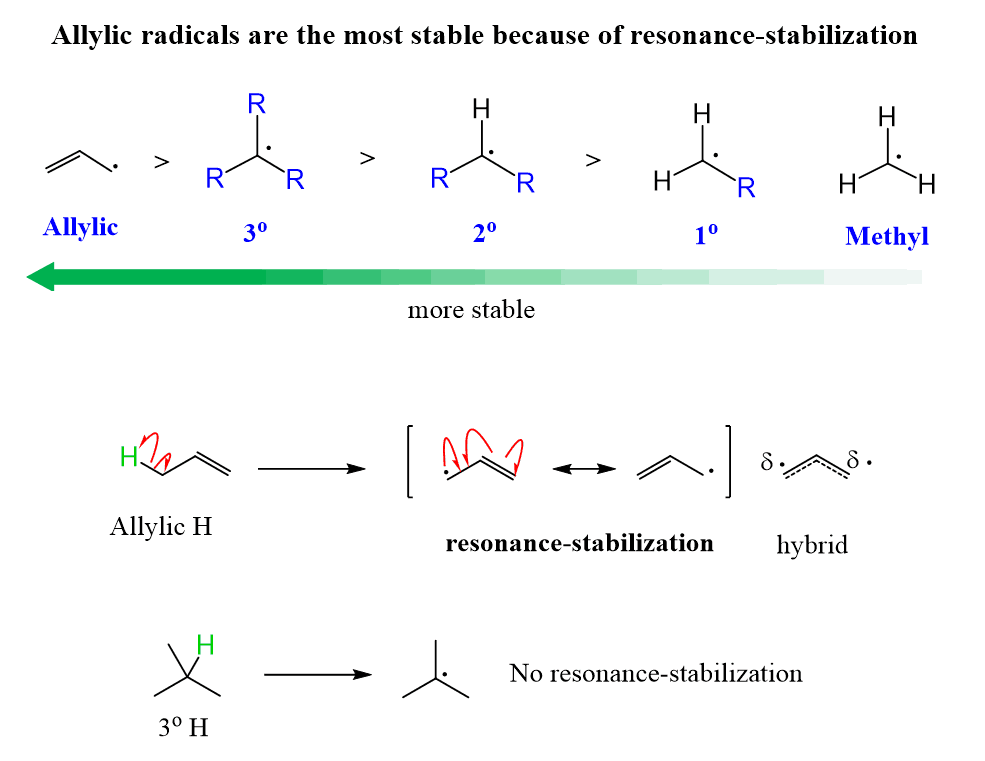 Notice that allylic radicals are more stable than tertiary radicals because of the resonance stabilization by the neighboring double bond.