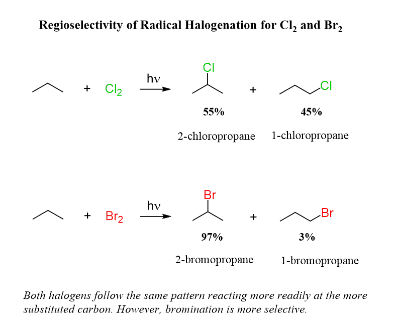 The pattern for radical stability is confirmed by the selectivity of radical halogenation. For example, the bromination of propane occurs primarily on the secondary carbon because of the greater stability of the corresponding radical intermediate. The selectivity is a little lower for chlorination, and we discuss this in the article on the halogenation of simple alkanes: