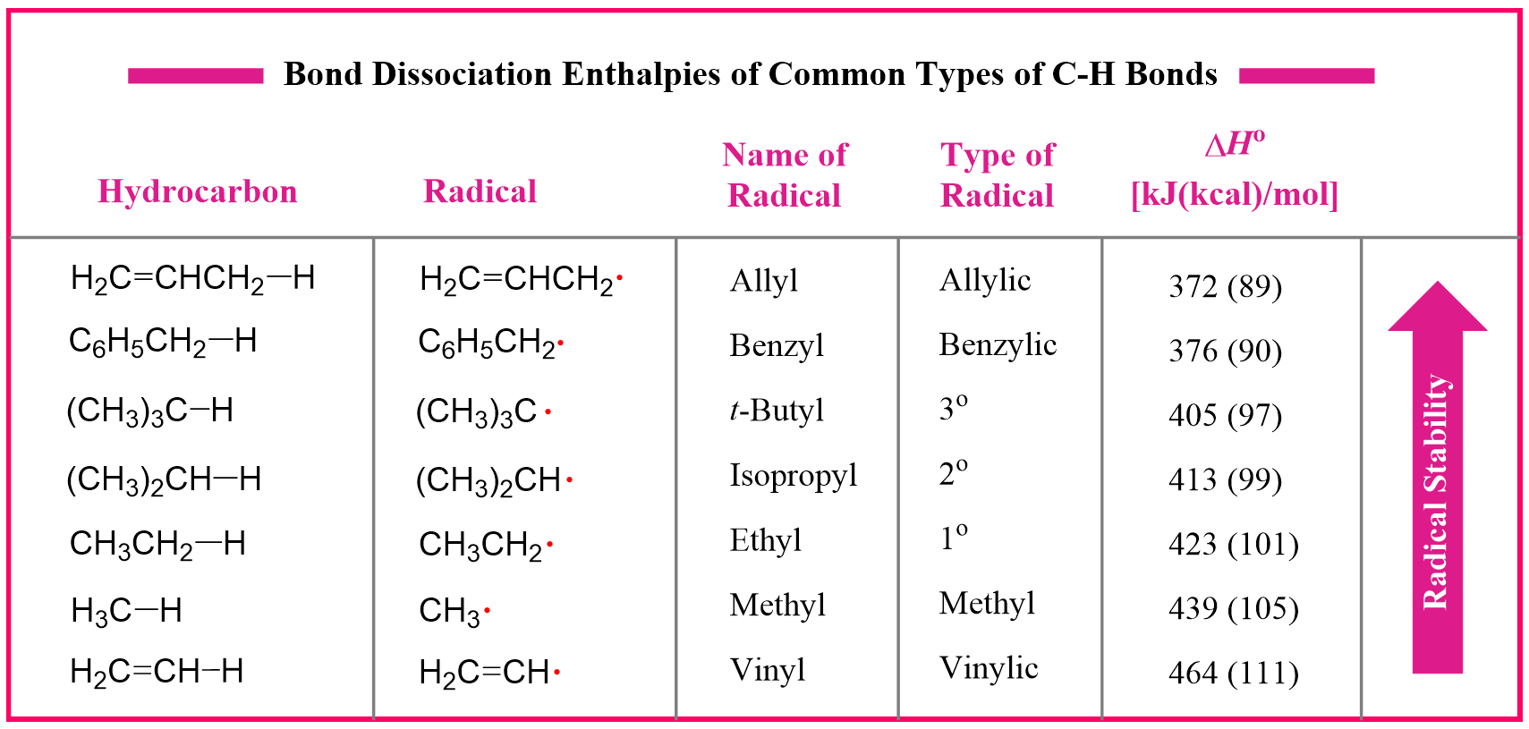 The stability of the radicals is measured based on the values of bond dissociation energies. Remember, these are the enthalpy changes associated with homolytic bond cleavage. The smaller the value of bond dissociation, the easier it is to break the bond: