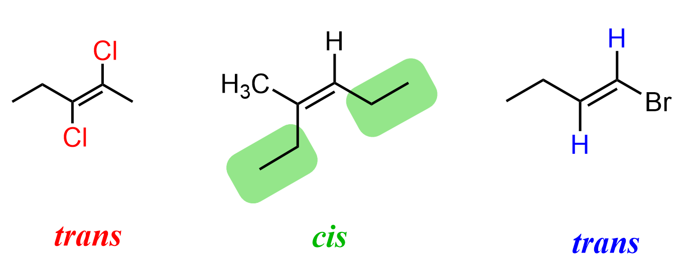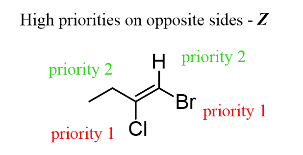 In this case, we cannot simply say “cis” or “trans,” because there is no obvious pair of identical groups to compare. Instead, we use the E-Z system, which assigns priority to the substituents on each carbon using the Cahn-Ingold-Prelog rules (R and S configuration).